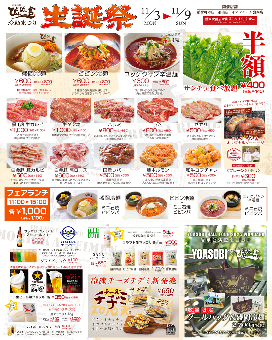 11/3㊊~11/9㊐の1週間、稲荷町本店、都南店、イオンモール盛岡店の3店舗【盛岡駅前店は開催しませんのでご注意ください】では、冷麺まつり「生誕祭」を開催します。